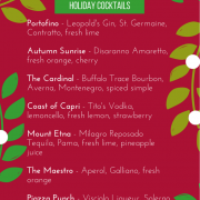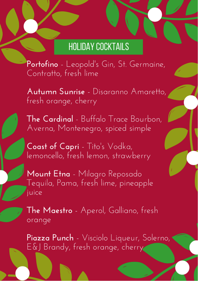 It’s that time of year again! Lists are being made, parties are being planned, reservations are being reserved (pssst..early holiday reservations at Carmine’s are now available), and moments are being captured that will soon become favorite memories. Now is the time to start enjoying all of the holiday festivities and Carmine’s wants to be a part of it! We are proud to introduce a new cocktail collection that will soon become another holiday favorite. Enjoy an expertly handcrafted cocktail with one of our appetizers, family-style pasta dishes, or as a start to the night’s festivities.